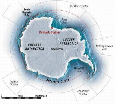 一条运输干线正在朝南极方向建造,此干线出发点是美国在南极地区的科学考察站——麦克默多站(图中红点)。总长为1600公里的干线将在2年内建成,最近几周施工人员已通过罗斯冰舌,正在接近横贯南极的山脉,该山脉挡住了通向南极之路。干线终点也是美国内陆极地站——阿蒙森-斯科特基地。