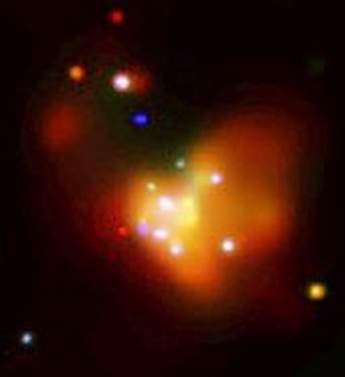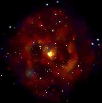 这是编号为M83的螺旋星系照片,只是照片不是利用可见光谱拍摄的,而是利用X射线光谱拍摄的(借助于“钱德拉”X射线望远镜),在这幅照片上明亮的中子星和黑洞散射的X射线清晰可见,最明亮的中心斑是新星激烈形成的区域,其中最老的新星现在年龄也只有2000万年(我们的太阳为50亿年)。