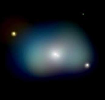 一个巨大的旋转气体圆盘位于该椭圆星系中,气体圆盘是由X射线发出的,据说这椭圆星系不是由于 < 1 > < 2 >