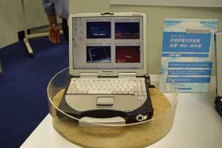 坚硬的笔记本电脑 在松下公司的展台上,这台放在沙盆里的笔记本电脑,外形比普通的笔记本电脑粗犷了许多。原来这是给特别的专业人士如地质考察队员等设计的,特点是防尘、防震和防水。工作人员把一台正在运行的笔记本电脑端起几十厘米高,然后松手, “嘭”的一声,电脑跌在桌面上,然而运行丝毫不受影响。