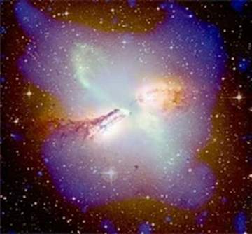 半人马星座A的巨大弧形气体结构不是别的而是直径为2.5万光年圆环的一部分,这一结论是哈佛-史密森天体物理研究所科学家在对“钱德拉X射线望远镜”拍摄的照片进行分析之后作出的。科学家认为,圆环所在位置及其大小说明约1000万年前发生在该处的一次巨大*。由可见光(橙*)、X射线(蓝色)和射电(红色和绿色)波段照片合成的图像,反映出半人马星座非同寻常的急风暴雨性质。一条尘埃和冷气宽带与相反方向的一高能粒子流交叉成一定角度,高能粒子流是从一巨型黑洞的腹腔中喷出。两条炽热气体弧形物位于与粒子流垂直的平面中,炽热气体弧形物具有X射线特性。