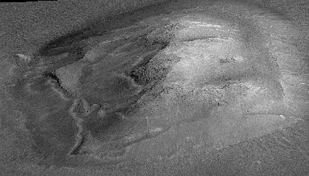 图3:2001火星环球勘察者拍摄的照片 当然,为了进一步增强这个证据的真实性,科学家们还使用了高精度的激光测高仪对该地区进行了扫描。通过对数据的处理,得到了这个“火星上的人脸”的三维图像。这下子恐怕谁也没话说了,因为从这张图像上可以看出,这个传奇般的脸没有眼睛,没有鼻子,甚至没有嘴巴!它只不过是火星上一座普普通通的平顶山。这就是25年来“火星上的人脸”的结局——一个十分滑稽的结局。