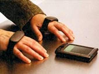 图2 瑞士圣斯博尔德工艺公司提出了另一种“虚拟键盘”方案,在双手上戴“手镯”(见图2),“手镯”能将手指动作转变成字母。但是要利用这种“虚拟键盘”工作需要进行训练和一定的想象力,因为在你面前并没有真实的键盘存在。