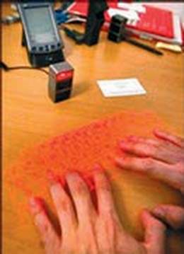 图1 众所周知,笔记本电脑携带方便,但是在工作时又不太方便:键盘太小或是没有键盘,使用起来十分费力。德国西门子公司在每年一届的计算机展览会上展出一种以色列发明的“虚拟键盘”(见图1),“虚拟键盘”用光线投影在桌子上或任何其它水平面上。当你移动手指并按压投射在桌子上的“键”时,你的手指会遮断激光束,这样的遮断会在笔记本电脑的显示屏上出现相应的字母。