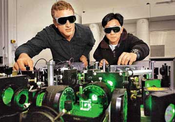 澳洲物理学家林秉溪(右)和鲍恩星期日在堪培拉的澳洲国立大学内 展示其成功远距输送包括信息激光束的研究结果 科幻影片中转瞬时空转移的梦想也许将成为现实。由华裔科学家林秉溪(音译)领导的一个澳大利亚研究小组,经过三年努力,在上月破天荒地将有加密无线电信号的激光束转移到一米之外,为“远距输送”踏出关键的第一步。