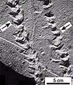 这些化石上的特有纹路像被风吹过的典型沙纹,而不是像海浪冲刷过的那种纹路,这一点对多足纲当时不是栖息在海洋中而是生活在陆地上的说法十分有利。发现最古老史前动物化石的加拿大和英国联合小组成员之一的布里斯托尔大学西蒙·布雷迪博士指出,“毫无疑问,地球上出现动物要比植物早得多。”化石上留下的踪迹彼此相距10厘米(见图1),留下踪迹的动物长有16只至22只脚和尾巴,爬行时脚和尾巴将沙子拖在后面。 < 1 > < 2 >