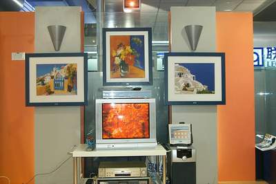 联想的电视机顶盒推出应该不是很短的时间了,但是这次展示的设备仍然吸引了记者的目光。两旁的油画其实是环绕立体声音响,这样一套设备摆放在居室之中也许不够“酷”,但绝对典雅。