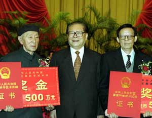 江泽民主席为获得2001年度国家最高科学技术奖的 中国科学院和中国工程院院士王选,中国科学院院 士黄昆颁发奖励证书和奖金 2月1日上午,中共中央、国务院在北京隆重举行国家科学技术奖励大会。中共中央总书记、国家主席、中央军委主席江泽民出席大会并为获奖代表颁奖。中共中央*局常委、国务院总理朱槠基代表党中央、国务院在大会上讲话。中共中央*局常委、国务院副总理李岚清宣读了《国务院关于2001年度国家科学技术奖励的决定》。中共中央*局常委、国家副主席胡锦涛主持了大会。