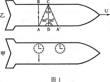 按相对论教科书考虑这样一个理想实验,假设宇宙飞船甲是一惯性系,飞船乙相对于甲以速度v作匀速直线运动(如图1),因而也是一个惯性系。飞船乙上从点A处在某一时刻放出一光信号,此光信号经位于B点(A、B两点间的连线与飞船飞行方向垂直)的镜子后反射回到A点,并由A点的光电管接收记录。在飞船乙上的宇航员看来,光信号的放出与接受这两个事件间的时间间隔为