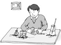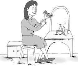 于是我找来弹簧、两根短钢丝、两块塑料片。先把塑料片按梳齿打好小孔,装进梳齿里;两根短钢丝一端连在梳子上,一端连接塑料片;再在梳柄上装上带弹簧的橡皮按钮,按钮与前根短钢丝连接。按橡皮按钮,薄塑料片就会由上往下推动,把缠在梳齿的头发推掉。这样一来,我的烦恼就解决了。