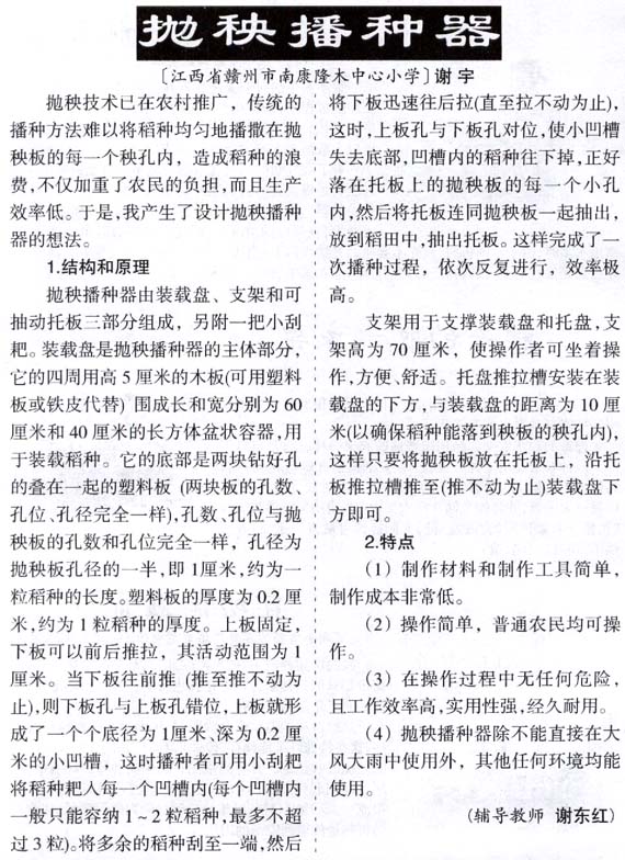 抛秧技术已在农村推广,传统的播种方法难以将稻种均匀地播撒在抛秧板的每一个秧孔内。