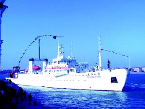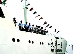 “大洋一号”曾是前苏联的一艘考察船,经过中国科学家的悉心改装后,“大洋一号”摇身一变,成为一艘5 600吨级的远洋科学考察船。从1995年以来,“大洋一号”先后执行了7个远洋调查和大陆架勘察等任务,是我国远洋科学调查的主力船舶。