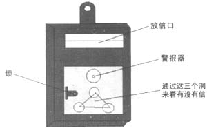 防盗信箱的形状和普通信箱一样,不同的是防盗信箱的放信口内装有活门(如图1所示),只能把信放进去。当有人想伸手进去取信时,活门受压,就会马上关上,装在信箱内的*器也会因为被活门碰到而发出声响,这样就可以把偷信的人捉住了(如图2所示)。如果是信件的主人,只要用钥匙打开信箱的门就可以顺利取出信件。信箱内的*器以普通电池作为电源。