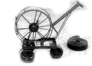 水龙带自动卷放机由手推柄、骨架、转盘、绕管毂、手摇柄、链条、上下齿轮、底座、调动杆和轮子等构成。所用材料都是从旧童车上拆下来的钢条、齿轮、链条、轴承等废旧物,经过焊接加工装配而成(如图)。为了防止磨坏水龙带,我又增加了一个防磨皮管,有效地保护了水龙带。
