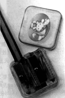 壳体上用螺钉固定安置有铅芯刀片和削木刀片-铅芯刀片的刀口长度为10毫米,约为刀片长度的2/5,且位于刀片左端,刀片其余部分是圆滑的,保证了在削铅笔芯时不会削着木质;削木刀片的刀口长度为17毫米,约与刀片长度相等。