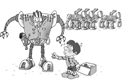 我利用上班的便利,花了一个星期的时间,在车间里制作了一个机器人。趁着看管不注意时,我又用车间里的缩微器,把这个机器人缩成只有蚂蚁大小。