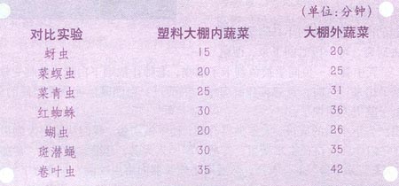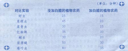 我把想法告诉小组的成员,大家觉得有理,动手做实验。我们从塑料大棚里捉来许多害虫,把它们放在大口径空水槽里,再把白醋倒入大蒜、洋葱、丝瓜叶、蕃茄叶浸出液,制成“天马无敌2号”生态农药,然后用小喷雾器向害虫喷洒,并进行了对比实验,害虫死亡时间如下: