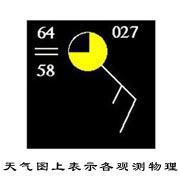 左图为天气图上表示某个台站各物理量的符号,其中的用*加亮的圆圈符号表示该台站的云量。右图给出了各种云量的表示方法,其中空心圆表示云量为0%,晴天;圆圈被填充1/4,表示云量为25%;圆圈被填充3/4,表示云量为75%;圆圈被填满,表示云量为100%;圆圈中有X,表示天空阴暗、模糊。