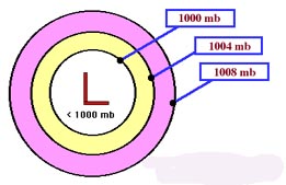 (1)低气压(简称低压),其等压线闭合,中心气压低,向外逐渐增高。空间等压面向下凹,形如盆地。