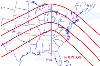 (4)高压脊(简称脊)是高压向外伸出的狭长部分,或一组未闭合的等压线向气压较低的方突出的部分。在脊中,各等压线弯曲最大处的连线叫脊线。气压沿脊线最高,向两边递减。脊附近的空间等压面,类似山脊。