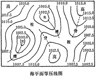(5)鞍形气压区(简称鞍部),是两个低压与两个高压交错组成的中间区域,其附近空间等压面形如马鞍。