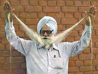 60岁的印度老兵辛格正在展示他那1.7米长的胡须,辛格希望他的长胡须能在2004版吉尼斯世界纪录中占有一席之地。
