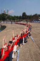 在2003年中国湖南旅游节开幕式上,在长沙世界之窗公园内的主干道上上演了一幕万人“多米诺”。共有1万名公开征集的吉尼斯纪录挑战者被分成20个方阵,列队分区组成不同主题的版块,在世界之窗主干道上依次整齐排列,以“多米诺”骨牌方式向后仰坐,万人叠起,最后通过服装颜色、艺术图案的变幻来体现“心手相牵,龙腾世界”的主题。 此次活动打破了原来由9250人在新加坡创造的最长人体“多米诺”吉尼斯世界纪录。