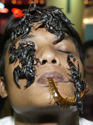 计划创造这一世界记录的泰国男子名叫汶他维,今年26岁,是一名专业的蜈蚣表演者。 在泰国南部一个海边旅游胜地附近的大商场里,汶他维沉着地进入一个12平方米的玻璃房子,里面有1000只活蜈蚣,汶他维将与这些蜈蚣共同生活28天,希望创造与蜈蚣共处时间最长的吉