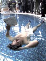 2001年3月13日,在四川省公证处公证人员的现场监督公证下,四川乐山人孙朝林以11小时零5分的战绩,超过该记录2小时45分,创下了一个新的水上自由漂浮吉尼斯世界纪录。图为孙朝林在漂浮过程中阅读报纸。