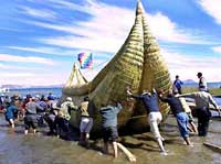 2002年8月25日,玻利维亚拉巴斯省的居民把刚刚造好的芦苇船推进的的喀喀湖。这艘芦苇船长达14米,宽5米,高2米,用3000捆芦苇编成,可以承载8吨重的石头渡过玻利维亚和秘鲁交界处的的的喀喀湖。