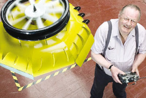 飞碟应用科安达效应(又称“附壁效应”)原理制成,由顶部一个电动推进器提供动力,还装有掌握操控的副翼。飞碟的功能介于气垫船和直升机之间。与直升机相比,它没有安装旋翼,可以撞击墙体而不用担心旋翼折损。与气垫船相比,它又能脱离水面自由高飞。