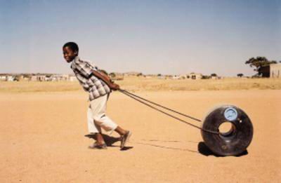 “Q鼓”水桶 容积75升,可以滚动,方便人们在取水地和住地之间来回运输。