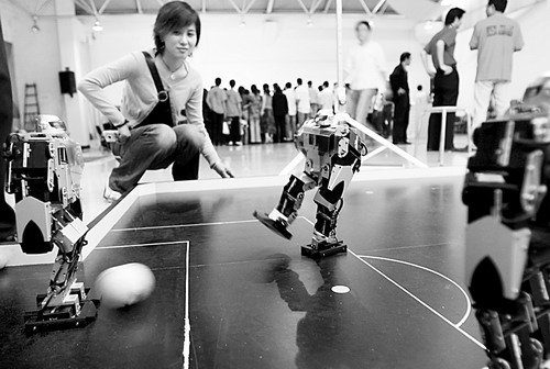 5月15日,参赛机器人将足球踢进球门。第八届全国机器人足球锦标赛于5月14日在武汉开赛,来自全国百余所高校的400多名队员参加14个项目的角逐。机器人展示的各种绝技令观众大开眼界。新华社发