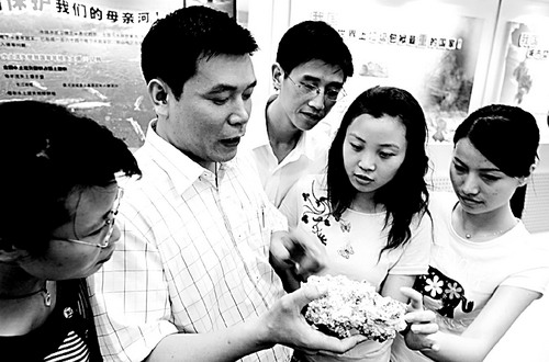 5月27日,在福建省福州市福建丰泉环保科技园,中国环保产业协会陈泽峰副会长(左二)向参观者展示用丰泉第三代热解炉焚烧后已无害化的垃圾结晶和用它们生产的空心砖等建材产品。据专家介绍,丰泉环保集团开发 的拥有自主知识产权,获国家科技进步三等奖的第三代热解炉已具有了世界先进水平。丰泉热解炉不仅可以使垃圾无害化处理实现零排放,而且还可以“变废为宝”为垃圾的回收利用提供一条可行之路。
