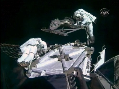 这是美国国家航空和航天局8月11日公布的“奋进”号航天飞机上的两名宇航员进行太空行走的视频截图。美国东部时间11日18时45分(北京时间12日6时45分),美国“奋进”号机组两名宇航员美国人里克·马斯特拉基奥和加拿大人 戴夫·威廉姆斯完成第一次太空行走,成功地为空间站安装了一个新结构组件。新华社发