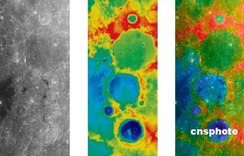 2007年12月11日,中国国家航天局发布的由“嫦娥一号”卫星11月26日获取的6轨立体相机数据拼接而成的“嫦娥撞击坑”。图幅位于月表西经6.9度到东经0.8度,南纬20.5度到南纬2.7度范围,幅宽约234公里,高约543公里。最上部为托勒密撞击坑,中