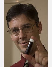 图片说明:Huber手中拿着一小瓶用新方法生产的绿色汽油物质。
