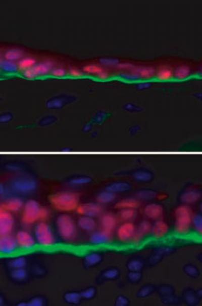 图片说明:在皮肤的外层,microRNA-203通过抑制p63蛋白分子(红色)的活性,帮助细胞构建了坚固的保护屏障。而当该miRNA无法阻止p63工作时,细胞就会增殖(下图)。(图片来源:The Rockefeller University)