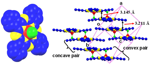 酞菁氧钛(TiOPc)是一种高效的有机光导体,在静电复印、激光打印中广泛使用。酞菁氧钛的a相中,分子形成凸凹相对的分子对,分子间有着大面积的共轭和非常小的分子间距:凸起的分子对之间的N6-N6仅3.145 Å,凹形的分子对间的C9-C28为3.211 Å。理论计算和实验结果都证明:a相的酞菁氧钛具有很高的场效应迁移率和开关比,这些特点,使酞菁氧钛有望成为一种具有潜在应用前景的有机场效应材料。相关结果发表在近期的《先进材料》上(Adv. Mater. 2007, 19, 2613-2617),并被Advanced Materials的主编选为VIP论文。