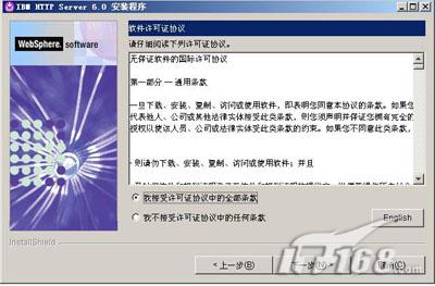 dFiles_6016/200805/2008052320563845.jpg > 图2 在图3中出现“欢迎使用IBM HTTP Server 6.0的InstallShield向导”画面,我们主要以InstallShield向导来安装IBM HTTP Server 6.0 Web服务器,单击“下一步”继续操作。然后出现“软件许可证协议”画面,选中“我接受许可证协议中的全部条款”,单击【English】按钮,显示的是英文的许可证协议;单击“下一步”继续操作(图4)。  图3 点击看大图  图4 点击看大图 接下来就是IBM HTTP Server 6.0安装的目录,默认为C:\Program Files\IBM HTTP Server文件夹;我们也可以单击“浏览”按钮将它安装到另一个目录,这里采用默认路径,单击“下一步”继续(图5)。 页码:[1] [2] [3] [4] [5] [6] 第2页、共6页 |
