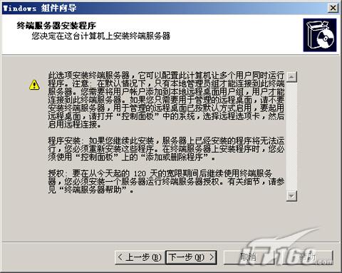 务器上。你需要将用户帐户也就是非管理员权限的用户添加到本地远程桌面用户组,用户才能连接到此终端服务器上。如果只需要用管理的远程桌面,请不要安装终端服务器,用于管理的远程桌面已按默认方式起用。授权:要在今天起的120天的宽限期间后继续使用终端服务器,你必须安装一个服务器运行终端服务器授权。(如图5)  图5 第五步:接下来讲师选择终端服务器的运行模式,有两种安全模式提供给我们,“完整安全模式”和“宽松安全模式”。前者可以为终端服务器提供最安全的环境,安全性最好,但是正因为安全所以限制也多了,某些为以前操作平台设计的应用程序可能无法正常运行。如果你使用了这个安全模式进行终端服务器操作的话,发现实际中限制性太大可以修改为“宽松安全模式”。宽松安全模式相比完整安全模式来说安全级别低了些,但是限制少了很多,用户可以访问关键的注册表和系统文件位置,运行一些为以前版本设计的应用程序时采用此安全模式。具体使用哪种安全模式需要根据实际工作中的需求去选择。(如图6) 页码:[1] [2] [3] [4] [5] [6] [7] [8] 第4页、共8页 |