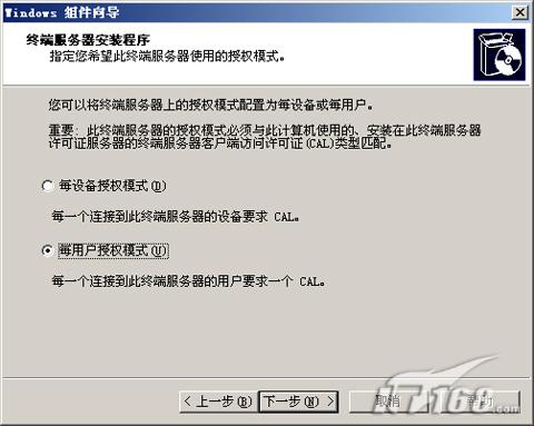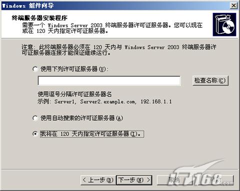 481.jpg > 图6 第六步:接下来是设置终端服务器安装程序,有三种许可方式提供给我们,一是使用许可证服务器,一般来讲公司都没有专门的许可证服务器。二是使用自动搜索许可证服务器,此项将自动搜索网络中的许可证服务器,对于那种许可证服务器不固定的网络应用比较适合。最后一个是“我将在120天内指定许可证服务器”,这个是我们最常选的,也就是先使用终端服务120,之后在向微软公司购买许可证,建立相应的许可证服务器达到授权的目的。(如图7)  图7 第七步:接着是选择服务器授权模式,在没有向微软公司购买授权许可证前,这些选项都是没有具体意义的,“每设备授权模式”是一个设备一个授权,在使用终端服务时只能在具有授权许可证的设备上。“每用户授权模式”是针对用户来购买许可证的,有多少个用户(帐户)要使用终端服务就要购买多少个用户许可证(CAL)。(如图8)  图8 页码:[1] [2] [3] [4] [5] [6] [7] [8] 第5页、共8页 |