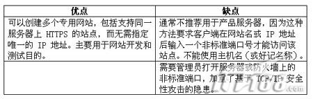 用端口号来区分多个网站的优缺点。  表4 例如,要访问名为 GhqIntranet 的专用网站,该网站的 IP 地址是 192.168.1.68,指派给非标准 TCP 端口 8080 的服务是 HTTP 服务,那么用户必须在其 Web 浏览器中输入 http://ghqintranet:8080 或 http://192.168.1.68:8080 来访问该站点。因此,对于多数 Internet 或 Intranet 站点来说,使用端口号来标识网站不是一个可行的方法。