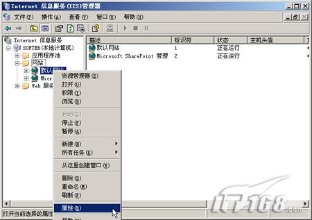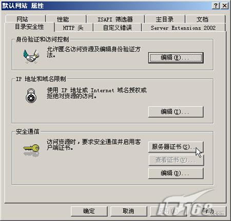 三、配置证书: 下面就要为各位读者介绍如何通过IIS证书向导配置我们需要的证书文件。 第一步:通过“管理工具”中的IIS管理器启动IIS编辑器。 第二步:在默认网站上点鼠标右键选择“属性”。(如图11)  图11 第三步:在默认网站属性窗口中点“目录安全性”标签,然后在安全通信处点“服务器证书”按钮。(如图12)  图12 第四步:系统将自动页码:[1] [2] [3] [4] [5] 第1页、共5页 |