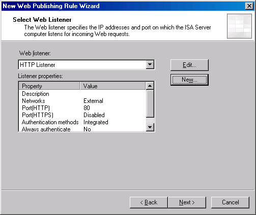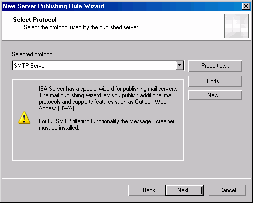 为80. 11.New Web Listener Wizard: ->Finish 12.Select Web Listener: ->Next,注意:我们创建的Web监听器出现在Web listener下拉列表里了。  13.User Sets:选择默认项All Users ->Next 14.Finish 15.Apply 16.OK ->Apply New Configuration 以下步骤创建SMTP服务器发布规则: 1.ISA2004控制台:Firewall Policy 2.Create a New Server Publishing Rule link 3.输入SMTP Server的名字 4.Select Server:输入被监听的SMTP服务的IP地址,此例中为10.0.0.1. 5.Select Protocol:选择SMTP Server  6.IP Addresses:勾选External 7.Finish 最后进行FTP服务器发布规则: 1页码:[1] [2] [3] [4] [5] [6] [7] [8] 第3页、共8页 |