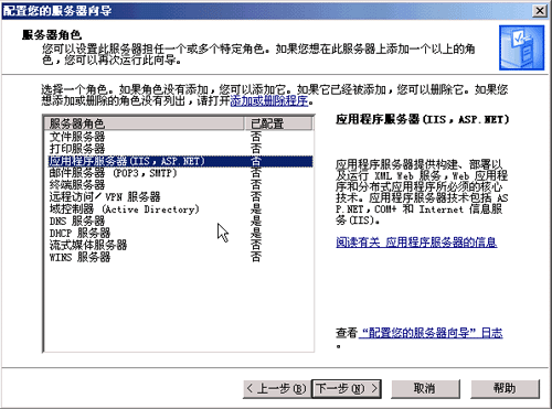 s 2003的做法可谓一大突破。在Windows 2003中,安装IIS有三种途径:利用“管理您的服务器”向导,利用控制面板“添加或删除程序”的“添加/删除Windows组件”功能,或者执行无人值守安装。 第一次启动Windows 2003系统时,“管理您的服务器”向导自动启动,如图一所示。  图1 选择“添加或删除”角色,在“配置服务器”向导中可以看到一系列可配置的服务器角色,其中就有“应用程序服务器(IIS,ASP.NET)”选项,如图二,选中该选项之后点击“下一步”,向导提供了是否安装ASP.NET和Microsoft FrontPage服务器扩展的选项。可以看到,微软在这里采用了一种新型的“安装任何部件之前总是征求用户意见”的IIS安装策略,对于微软来说,这是一个彻底的转变,证明微软确实在认真对待安全问题。  图2页码:[1] [2] [3] [4] [5] [6] [7] [8] 第2页、共8页 |