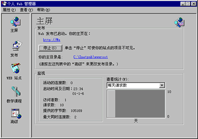 的启动而自动运行。  现在打开一个IE或其它浏览器窗口,在地址栏中输入“http://localhost”、“http://127.0.0.1”或者“http://你的IP地址”。是不是看见了Microsft Personal Web Server的默认页面!这表明你的PWS已成功在运行了。 让我们来看看其管理器界面:  可通过双击屏幕右下脚的PWS图标,或进其相应的程序组来启动“个人Web管理器”。 由其管理器界面可以看得出它有五个部分,可分别管理不同的功能,下面分部分来讲解各个功能模块的作用。 1、主屏 主屏又细分为“发布”和“监视”两部分。“发布”中的按钮可以控制你Web服务器的运行、停止。“监视”中的内容是对你Web站点访问的一些页码:[1] [2] [3] [4] [5] 第2页、共5页 |