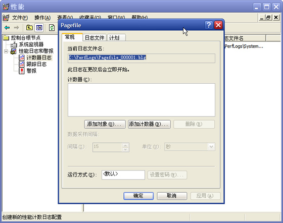 是科学的。我们可以借助Windows 2000/XP/2003中的性能监视器来判断虚拟内存的大小是否合理。 在“运行”中输入“perfmon.msc”,展开左侧的“性能日志和警报”,双击“记数器日志”,在右侧空白处点鼠标右键,选择新建日志设置,命名为Page File,回车确认,会出现图1所示的窗口。  图 1 点击“添加记数器”按钮,在弹出窗口的“性能对象”下拉菜单中选择Paging File,在“从列表选择记数器”中选择“% Usage Peak”,在范例中选择“_Total”,点击“添加”按钮,最后关闭这个窗口。 点击图1中的“确定”按钮,点击“是”创建日志文件。接着打开“日志文件”选项卡,在日志文件类型下拉菜单中选择“文本文件(逗号分隔)”,然后记住“例如”框中显示的日志文件的路径。 点击“确定”后这个记数器已经开始运行了,你可以在电脑上进行你的日常操作,并尽可能多地打开和关闭各种经常使用的应用程序和游戏。经过几个小时的使用,基本上记数器已经可以对你的使用情况作出一个完整的评估。 接下来页码:[1] [2] [3] [4] [5] [6] [7] 第3页、共7页 |