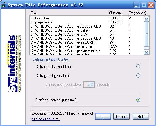 二:我们也可以借助软件来简化我们的操作。这里使用的是一个叫“PageDefrag”的免费软件(PageDefrag v2.32下载地址:http://www.sysinternals.com/Utilities/PageDefrag.html)。运行之后将会看到如图4所示界面。  图 4 从该程序的主界面中,我们不仅可以整理“pagefile.sys”的碎片,还可以整理很多其他平时因为被系统锁定而无法整理的系统文件。由于该软件不能在系统运行的时候对分页文件进行独占性访问,整理工作会在下一次启动系统的时候进行。你可以按照需要,选择下次启动时整理(Defragment at next boot),或者每次启动时整理(Defragment every boot),这里推荐使用前者。 最后,如果你使用第三方的磁盘碎片整理软件,例如O&O Defrag,那么这类软件自带的Offline Defrag(脱机整理,或者其他类似的称呼)也可以在系统重新启动的时候整理这些被锁定的系统文件。