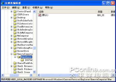 四、撤消检查预定的任务 每当系统连接到其他的计算机后会检查对方计算机上所有预定的任务,检查时需要30秒的等待时间。我们可不希望把时间耗在这上面,在注册表编辑器中展开主键 [HKEY_LOCAL_MACHINE\Software\Microsoft\Windows\CurrentVersion\Explorer\RemoteComputer\NameSpace],删除其子键——,Windows就不再检查预定任务了(如图4)。